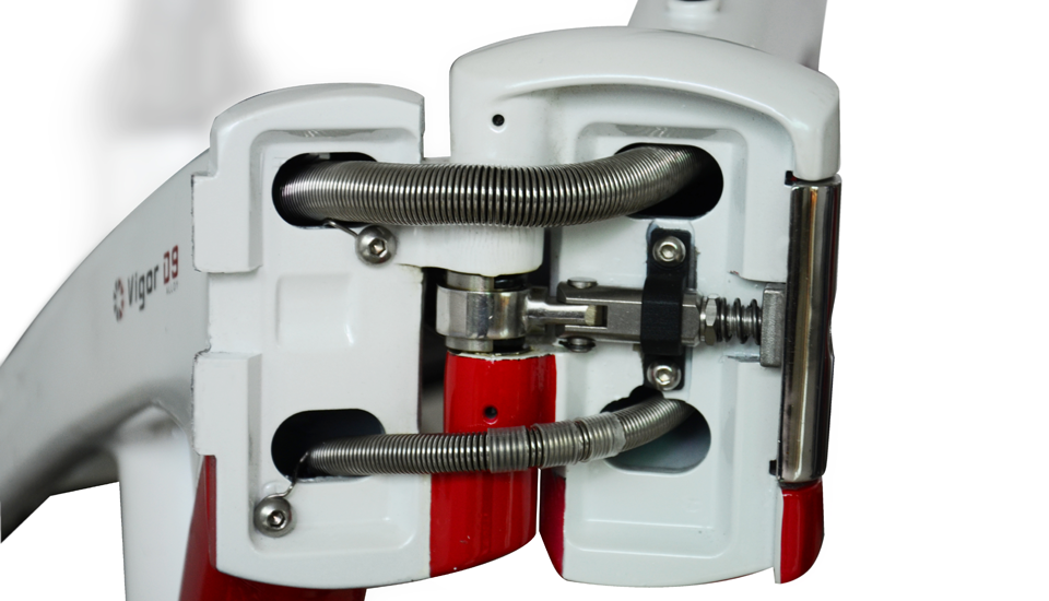 本實(shí)用新型公開了一種快拆腳蹬裝置,曲柄與腳蹬之間可快速拆卸及安裝,在曲柄外側(cè)的腳蹬軸插接對(duì)應(yīng)位置設(shè)置紅色警示帶。在腳蹬軸并未完全鎖緊狀態(tài)下,腳蹬與轉(zhuǎn)接套之間存在一定間隙,很容易發(fā)現(xiàn)該紅色警示帶,并提醒使用者注意插進(jìn)腳蹬軸。(專利號(hào):CN201020246213.X)