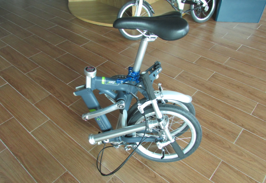 本實(shí)用新型公開了一種自行車折疊定位裝置,車架的前臂與中臂通過(guò)鉸軸鉸接連接,所述鉸軸軸線與后輪軸軸線在水平面內(nèi)的投影具有一定夾角,在車架設(shè)置定位裝置,在折疊狀態(tài),所述定位裝置頂住車架折疊后的另一段車架。本結(jié)構(gòu)能有效防止前后輪轉(zhuǎn)動(dòng)過(guò)限,前后輪上相對(duì)應(yīng)位置設(shè)置相配合的連接裝置,以鎖緊前、后輪。(專利號(hào):CN201020515073.1)